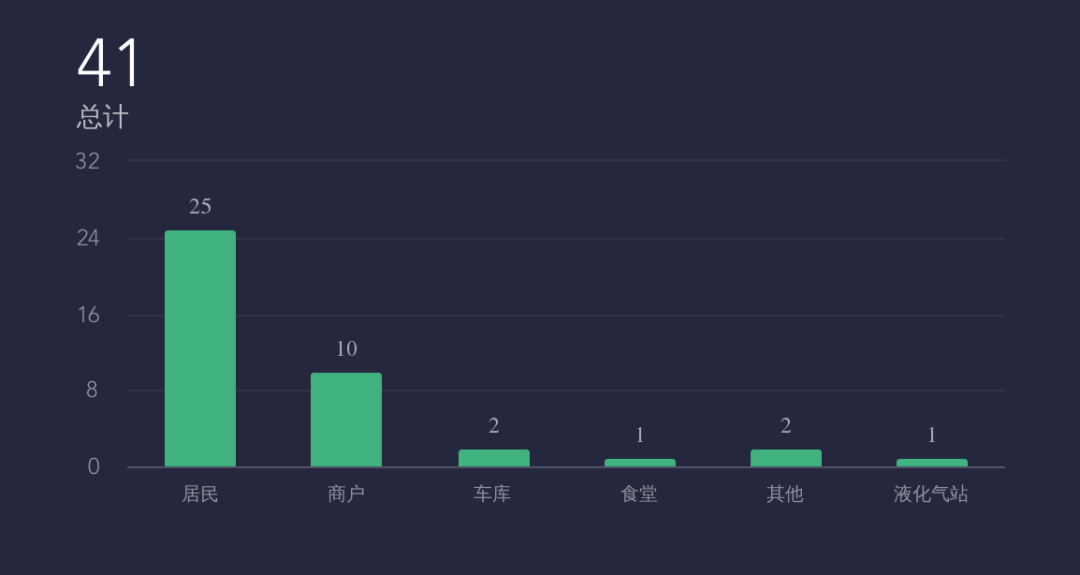 41起室内燃氣安全新聞中,10起發生在商戶,25起發生在民居,民居占比61% 。此外改建車庫事故新聞數2起,食堂❓及液化氣站燃氣事故新聞各1起。